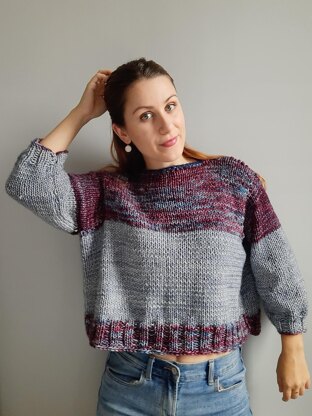 --Wide, lightweight, cropped sweater, perfect for spring or fall nights --Hangs loose off the shoulders (drop shoulder style) and is extra wide for a comfy cozy fit --Available in sizes XS-XL (model is wearing size S) --Not a box sweater - pattern includes easy instructions to make an allowance for the neck and to create shape around the shoulders