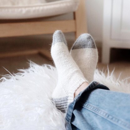 "A retro shortie sock featuring a color-block design and sturdy heel for extra durability, The Lounge Socks are a quick project to knit a perfect pair of everyday socks for all seasons."