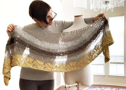 The mellow on is a beautiful and very comfortable crescent shaped shawl. Knitted from the top down in relaxing garter stitches flanked by a pretty lacy edge. The shawl increases steadily right up to where the gorgeous shell lace border starts.