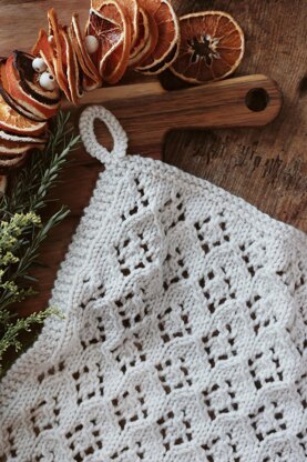 "Stunning lacy diamonds dance and cascade harmoniously, creating a gorgeous texture and eyelet intrigue for the perfect modern kitchen decor item."
