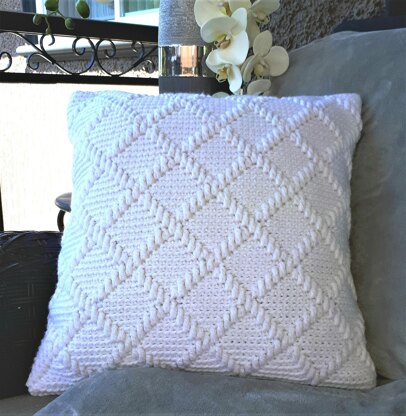 The Milano Pillow Cover, is beautifully textured using the Half Treble Crochet, crisscrossed over Single Crochet in the back loop. This cover is crocheted in the round and is seamless on the sides. The back of the pillow has an envelope style flap, held down with a decorative button of your choice, for easy insertion of a pillow form and for easy caring. The finished size is approximately 17" x 17 ". Using a #4 Worsted weight yarn, will result in a smaller pillow cover, unless the adjustments are made using mulitples of 12 (+1) on each round. The bottom of the pillow is seamed by using the Zig Zag Joining Slip Stitch.