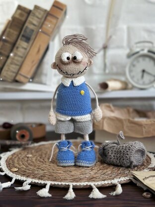 In this pattern, I will tell you how to crochet a funny monster schoolboy who will cheer you and everyone around. The schoolboy is crocheted with a crochet hook only. His arms, legs, and neck bend due to the wireframe inside. All clothes are not removable and are attached to the body. He has a removable backpack where he can hide his textbooks and notebooks but also secret notes and treasures. The crochet pattern consists of 34 pages and is accompanied by more than 90 photographs. The height of the toy using the materials stated in this pattern is about 23 cm/9 inches.