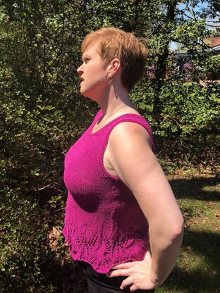 This top is named for both the yarn colorway, and the Orchid lace panel encircling the generous hem. Dragonfly Fibers Dance is my favorite warm weather yarn. It has a lovely feel while knitting and a luscious drape while wearing.