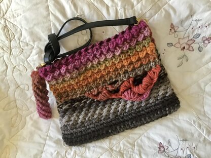Unique design in tote bags. Crocheted entirely in one piece with no seams using simple stitches throughout. Textured with raised stitches. Roomy and sturdy with detachable shoulder straps. Free form flap motif, and tube motif.