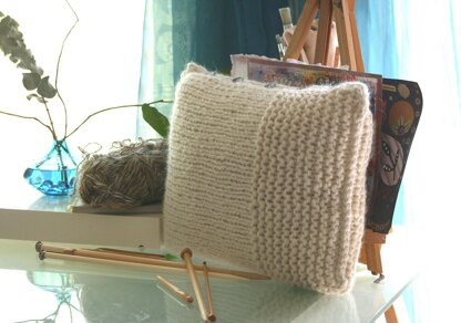 I love basic knit stitches – especially wonderfully squishy garter stitch. I worked these basic stitches and, having combined them with clever three-implement bind-offs (my answer to the three-needle bind-off), produced this seamless, washable, soft alpaca-blend pillow cover with clean lines that so speaks to my design heart.