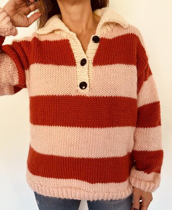 This polo sweater is everything this season! The style is comfortable, fun, wearable, and perfect for a casual day out. It looks great with jeans or a skirt. Knit with a US#11 needle and chunky weight yarn it flies by in a fun and easy way. You can knit this in stripes as written or solid if you prefer.
