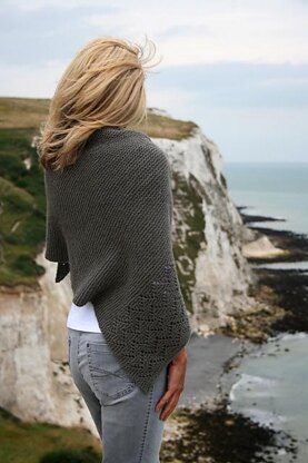 The Sentinell is made out of worsted weight yarn knit in garter stitch and finished off with a simple lace pattern also set against garter stitch which makes it a reversible piece. Thanks to the bias construction it has fabulous drape. Thicker yarn and simple stitches make the knitting go by very quickly. Its size can be changed easily. Instructions are both written and charted. A simple shawl for knitters who would like to try lace knitting.