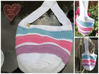 Market shopper made using mercerised cotton. Gauge, whilst not important changes the finished size. This is a great bag to make and carry around to the beach, markets etc. It can be washed and reused.