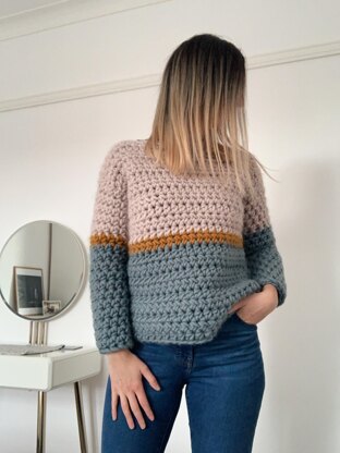 US Terms -- IMPORTANT: If you use a different fibre yarn, you will be unlikely to meet the correct gauge. Super chunky/bulky *wool* is required. -- DESCRIPTION: Cosy up in this stylish, chunky crochet sweater this winter. made with 100% chunky wool and featuring an on-trend asymmetrical stripe. This is an easy and quick project that's suitable for beginners, as it's made with basic crochet stitches and simple shaping, but is also great for more experienced crocheters looking for a fun and cosy winter project. -- SKILLS: Suitable for beginners / half-double crochet, slip stitch / crocheting into edges & armhole / joining -- MEASUREMENTS: (XS - fits chest 28-30") (S - fits chest 32-34") (M - fits chest 36-38") (L - fits chest 40-42") (XL - fits chest 44-46") Body length and sleeve length can be adjusted and adjustment details are included in pattern.