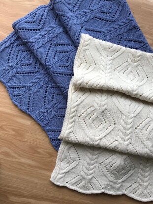 The Sunderland design, with its cables and lace, can be knitted as a rectangular wrap, wider shawl or stole, as well as a wide scarf. The pattern has two slightly different options: a 4-stitch cabled version with center slipped stitching, and a 6-stitch wider cabled version without the center slipped stitching.