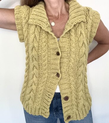 Ah, this cable pattern is so fun and addictive! If you know how to do a basic cable you will be fine with this design. This chunky vest is perfect to wear over anything from a tee to a blouse or dress. It looks good open or closed.