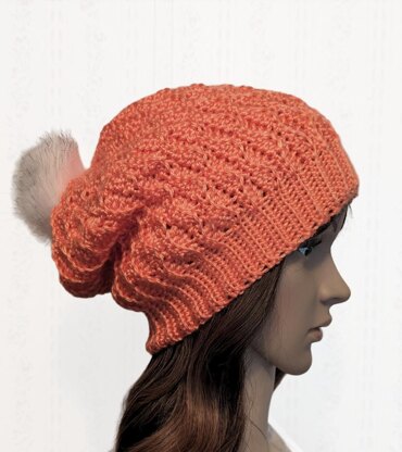 This quick and easy, unisex beanie is crocheted with a wavy design. Worked in a rectangle, it makes for easy fitting, with crown shaping every 8th row. It is then cinched at the top of the hat, and seamed down the back. Because it is worked in back and forth rows, you could get creative and use multiple color yarns for stripes! Instructions included for child and adult sizes, with slouchy beanie or more fitted beanie options.