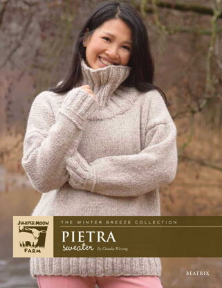 Juniper Moon Farm Pietra Sweater will be your new favorite sweater for snuggling up this winter! The women’s pullover is knit in Beatrix from the bottom up and then seam. The neckband is picked up around the neck edge and worked in the round. Beatrix from Juniper Moon Farm is a stunningly soft bulky weight yarn with a lofty blend of extra-fine Merino wool and angora fibers blown into a nylon chainette tube. Lightweight and fluffy, Beatrix has a beautiful halo and a luxurious feel.