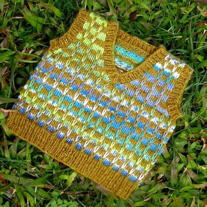 The Xanadu tank top is knitted bottom up until the sleeves and then the fronts and back are worked separately. The texture and colours come from using a plain and variegated yarn combined with slipped stitches.