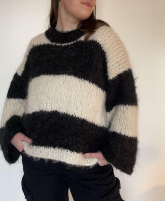 Thea sweater is a cozy and oversized sweater. It is worked top down on 10 mm needles with stribes in 2 strands of Drops Melody. The sweater has wide sleeves and are casted off with an I-cord edge. The sweater has ribbed edges at the bottom of the sweater and at the neckline.