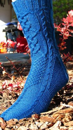 Skill Level: Intermediate; the sock includes basic top-down construction featuring a heel flap, short-row heel turn, and wedge toe; major cabling, textured stitches, and lots of charts. The ability to read a knitting chart is a must, although all symbols are clearly defined.