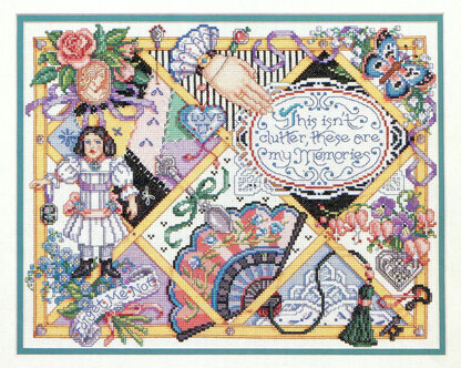 Designed by: Sandy Orton. A Kooler Design Studio sentimental favorite by designer Sandy Orton. Sandy’s specialty is bringing many elements together into delightful and detailed samplers. This design is no exception. The sentiment of “This isn’t clutter, these are my memories” will resonate with many of us who cherish our heirlooms and lovely possessions.\n