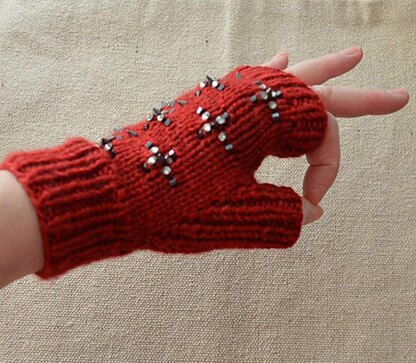 Here's a pattern that's a little nice and a little naughty. It has an overall flower pattern with Miyuki size 6/0 beads and "Swarovski Crystal Buttons" in black rhodium finish in color Black Diamond with black rhodium finish (3mm) from Crystaletts. On closer inspection, you will notice that the center of the flowers are little "Micro Spikes" from Crystaletts. These spikes and beads are new on the market and fabulous! The cool little spikes are not big enough to hurt yourself on them, but big enough to look a little dangerous. The buttons and spikes are hooked onto the knitting with a size US 13/14 steel crochet hook, just like the beads - very easy!