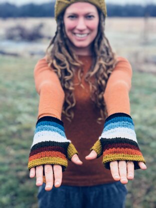 Pick 9 colors of worsted scraps and make these mitts! These simple fingerless mitts are quick and exciting to make as you progress through nine colors! I chose a 70's color theme, hence the name, but color choices are completely up to you! You will work these boxy mitts flat before seaming and then pick up stitches for the thumb.