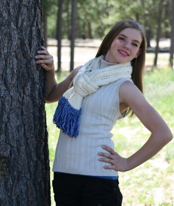 This scarf knits one fringe end first, then pick up and knit the body of the scarf for half the length. Repeat for the second half of the scarf and do a Kitchener stitch to join the halves. An internet address for a great Kitchener stitch tutorial from knitty.com is included in the directions. The scarf has 3 repeats of the pattern. In addition, the scarf uses optional feathers and a feather tutorial is available via email knittingwithfeathers@aol.com