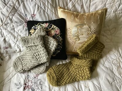 ONE SIZE FITS ALL crocheted socks. Made entirely in one piece with one seam! Simple crochet stitches throughout. Warm and comfy.
