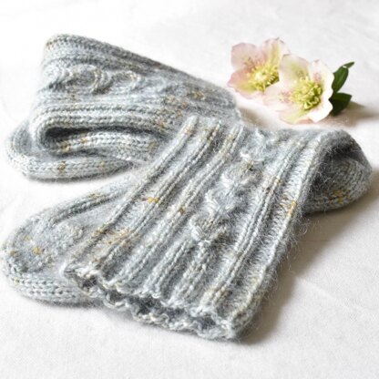 A luxurious pair of socks for lounging around the house and keeping the chill off your feet, they knit up quickly and would make an excellent gift. The sock yarn and mohair and silk lace are held together and it's a great pattern for a hand dyed semi-solid or speckled sock weight yarn, or you could use a DK weight