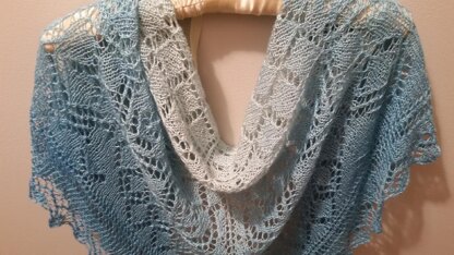 A triangular lace shawl with lace edging shown in an exquisite aqua gradient, but perfectly amenable to a fingering or sports weight. The pattern is charted only, but easy to accomplish if the knitter is familiar with chart-knitting.
