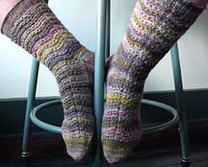 A repeating pattern of ridges and holes runs down the leg and over the foot of this top-down sock in three sizes S(M, L) like lapping waves. The gently curving motif is very easy to work and shows off a soft, self-striping yarn beautifully. Can be reversed for toe-up construction.