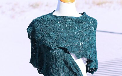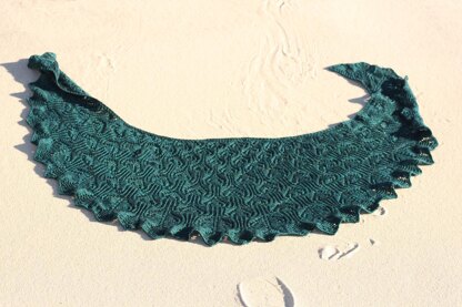 The river reaches the sea and finds its way over rocks and shallows to the open. Tidepools and the water running over and through rocks, collecting in pools and finally flowing freely through the underwater forests of the ocean is depcited in this generously sized, top down crescent to half circle shawl.