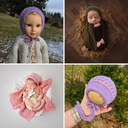 This is a pdf downloadable knitting pattern, written in English, using standard US terminology, for you to knit a DK weight, Tiffany Baby Bonnet photo prop in sizes preemie to one year (plus instructions for your 18” doll, as well).