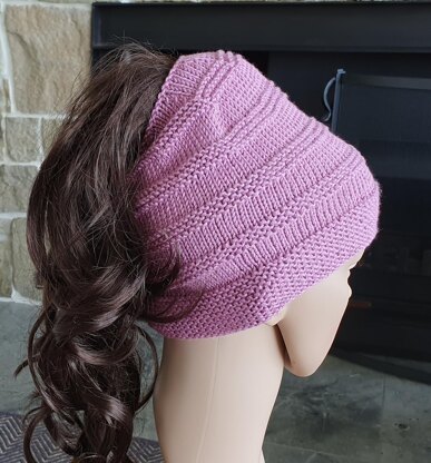 This ponytail/messy bun Beanie is worked in blocks of garter stitch and stocking stitch.