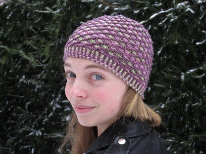 Using a solid and a variegated yarn, this toque has a cable cast-on with corrugated ribbing for the brim. The stitch pattern uses slipped stitches and allows the variegated yarn to stand out. It reminded me of a Tiffany lamp, hence the name Tiffany Toque.