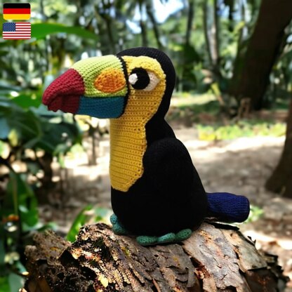 The finished toucan will be about 23cm. Of course, the size can vary depending on whether you crochet tight or loose. The choice of wool is also important. I crochet with Apollo cotton yarn 125m/50g (100% cotton).
