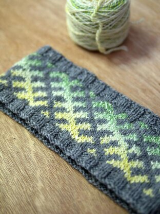 A strong graphic moves briskly across the surface of this cozy headband in four sizes (XS/S/M/L) for a fun, quick knit—or work several extra vertical repeats to make a deep neckwarmer. This design pairs a solid natural gray with a bright gradient yarn in a pattern where foreground and background are interchangeable. Use soft, lofty yarns that bloom easily for a final result with a consistent surface. This project is an excellent choice for those just starting out with stranded colorwork, as it is easy to work and quite addictive.
