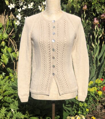 A truly timeless, classic cardigan with raglan sleeves. Flattering textured lace eyelet panels gracefully run down the fronts, while straightforward stocking stitch is used on the back and sleeves. All the borders are in single rib. Worked bottom up and with full written instructions.