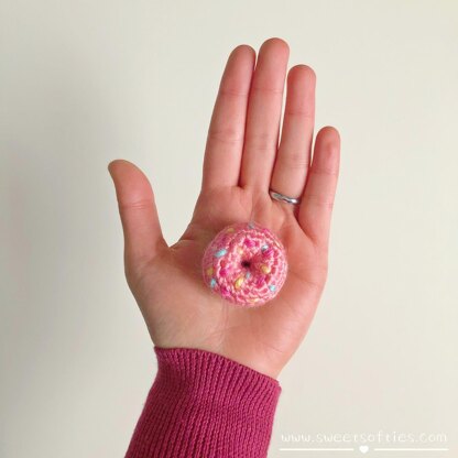 The Tiny Baby Donut is super quick to work up, beginner-friendly, and perfect for your amigurumi doll or stuffed animal to hold! It can also make a pretty darn cute little keychain, necklace charm, bag or cell phone charm, miniature pin cushion, birthday gift for a friend, or even as a summer party favor! The possibilities are endless with flavors and sprinkle toppings!