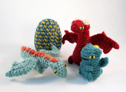 In these PDF instructions are patterns for three different dragons, the smallest is the Tiny Dragon Hatchling at 1.5”/4 cm tall; the other two Dragon Hatchlings are slightly larger with the standing one being 5”/12 cm long and the sitting one 2.5”/6 cm tall. They have been designed to be made with minimal sewing together, and the small size means that legs, horns, spines (and wings for the Tiny Dragon) can be made as you crochet. There are also patterns to make various eggs for each of these dragons, in two different sizes.