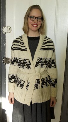 This shawl collar cardigan with graphic colorwork is sized for tweens, teens, and adults. Knit with bulky yarn, it looks much more complicated than it is. The patterning is done with mosaic knitting, so only one strand of yarn is used at a time. The body and sleeves are both worked flat to the armholes, at which point they're joined and the raglan yoke decreases are done seamlessly. Stitches are picked up along the front edges and neck opening for the ribbed edging and shawl collar. There are no closures other than an optional belt.