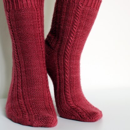 Meaning cosy in Scottish Gaelic, Tìorail features all my favourite cosy knitting features! A wide garter stitch panel is bracketed by stocking stitch columns, slipped stitch cables and broken rib running up the centre of the leg. With four widths and flexible length fitting, these are a great pattern for everyone.