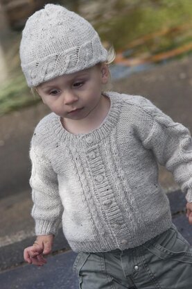 A mello little knitted cable jacket with saddle shoulder and a coordinating hat.