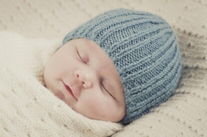 A ribbed beanie with matching ribbed booties, an simple knit and purl rib pattern to keep little baby warm.