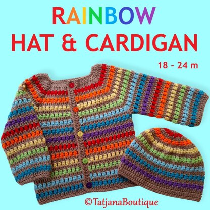 Crochet PATTERN toddler rainbow cardigan and hat set. ♥♥♥ Size in this pattern 18 - 24 MONTHS. The pattern is written in US crochet terms but with a conversion at the beginning of the pattern to UK / Australian terms. Its just that some of the names of the stitches are different. Materials & tools you will need: ★ Acrylic or other yarn 150 gr approx. - DK, Double Knitting in UK, Light Worsted in the USA, 8ply in Australia. ★ Crochet hook size 4.5 mm. ★ 5 buttons. ★ Yarn needle to weave in ends (optional).