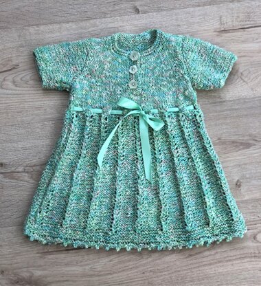 A lovely little dress with front buttoning neck. The skirt section is in a simple vertical eyelet pattern set on a reverse stocking stitch background - this adds surface interest as well as making the eyelets stand out. There are 2 rows of shaping incorporated to give flare to the skirt. The yoke is in plain stocking stitch with eyelets made for the ribbon tie. If you prefer you could crochet a tie instead. The hem has a pretty picot edge to complete this cute design. Worked bottom up and with full written instructions.