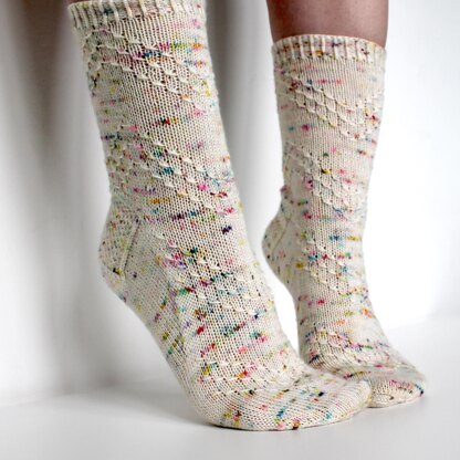 Togair means desire or covet in Scottish Gaelic. This pattern features a delicate V-shaped pattern on each foot. The pattern is stunning with speckled yarns and also works beautifully with semi-solid yarns. Knit from the toe up with a gusset and heel flap, these socks are the perfect mix of relaxing knit and engaging pattern. With three widths and flexible length fitting, these are a great pattern for everyone.
