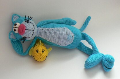 The pattern is quite easy to follow and the finished tomcat is about 34 cm tall (about 13,4 inch.). The fish is 10 cm long (about 4 inch.). The yarn is only recommendation. We usually use Czech production wool but you can use anything you are used to.