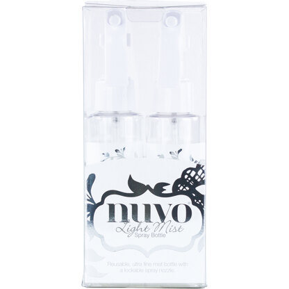 Perfect for use with Nuvo Embellishment Mousse. Fill the Nuvo Light Spray Bottle with water and then add Nuvo Embellishment Mousse to create unique textured backgrounds. This 3x7x2.75 inch package contains two 3.5 fluid ounce spray bottles. Imported.