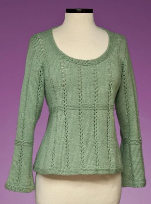 I had designed a very feminine pullover with a wide, deep scoop neck, and I wanted an easy openwork pattern that would lend itself well to the design. I think this little bit of eyelet is exactly what this sweater needs to make it truly stunning. The eyelet carries through the Garter stitch trim at the waist and bell sleeves. I love how this piece turned out!