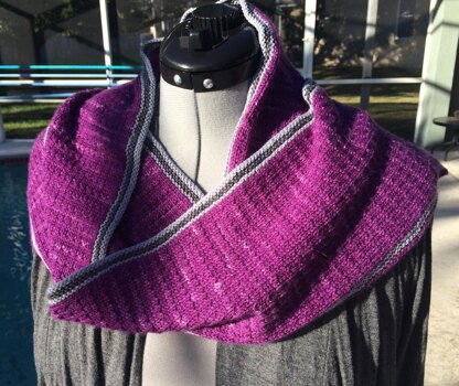 This simply textured scarf with asymmetrical borders is delightful on both sides, and may be worn many different ways. With a width of 6 ½” (16.51 cm) and a length of 67” (170.18 cm), your choices are almost limitless!