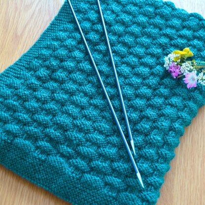 Design: An easy-knit textured baby blanket with a basketweave pattern available in 3 sizes