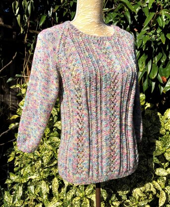 A gorgeous sweater with vertical lines of eyelets and twisted stitches between flattering ribs. The crew neckband sits away from the neck and with the raglan sleeves makes this super comfortable to wear. The yarn used is a joy to wear being a perfect blend of cotton and acrylic.